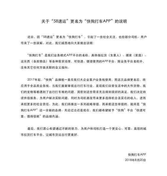 针对更名带来的歧义,快狗打车也给出了正面的回应。